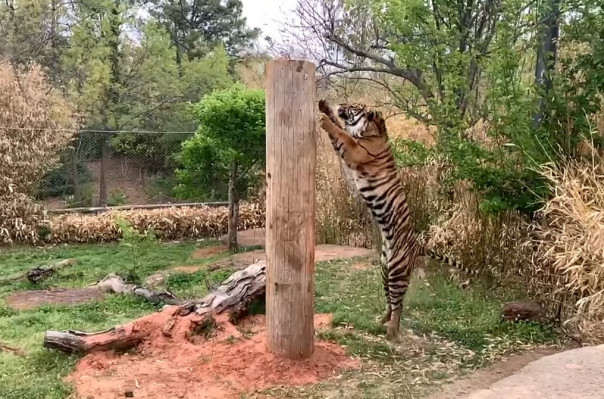 Величина столба, на вершине которого тигра ждет вкусная награда, в данном случае не сообщается, но известно, что тигры, чьи размеры варьируются от 2,2 до 2,55 м, могут прыгать на пятиметровую высоту. Густи не оплошал: он с первого раза допрыгнул до верхушки столба, ухватив лакомство. Источник