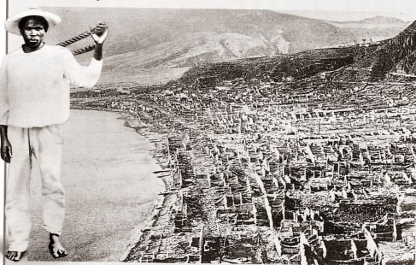 Этот коллаж представляет нам и Люджера Сильбариса, и вид Сен-Пьера после катастрофы. Неудивительно, что вскоре простой рабочий стал известен в Америке и Европе как «человек, переживший Судный день»