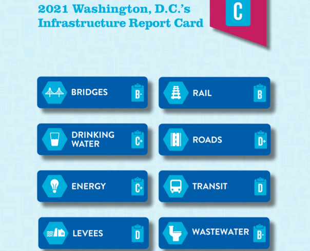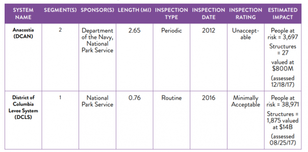 4. Дамбы (оценка -D). Округ Колумбия подвержен трем типам наводнений: речным наводнениям из рек Потомак и Анакостия, дождевым наводнениям и прибрежным штормовым волнам. Кроме того, водораздел, который способствует затоплению реки Анакостия, берет свое начало в Бладенсбурге, штат Мэриленд, сильно урбанизирован и быстро генерирует большие объемы ливневой воды во время дождей. Округ Колумбия имеет две системы уровней : Система дамб округа Колумбия (DCLS) и дамба округа Колумбия Анакостия (DCAN) общей протяженностью 3,41 мили. В последний раз DCLS была оценена как “Минимально приемлемо” во время плановой проверки 2016 года Инженерным корпусом армии США (USACE) и получила аккредитацию Федерального Агентства по чрезвычайным ситуациям (FEMA), хотя не испытывалась на максимальную загрузку. DCAN с 2012 года оценивается как “Неприемлемо”.