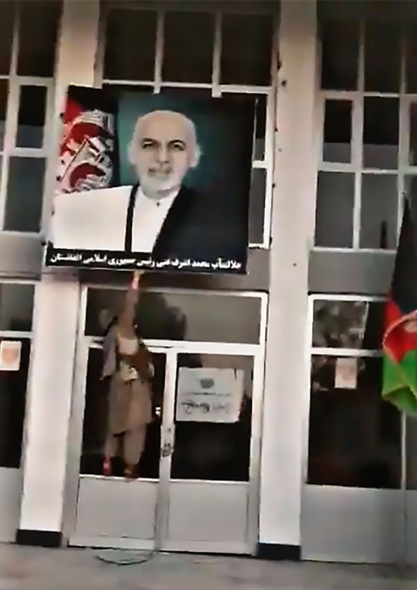 Талиб срывает портрет бежавшего президента Ашрафа Гани в захваченном городе.