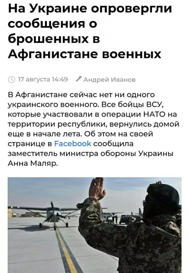 Заместитель министра обороны Украины Анна Маляр опровергла информацию о том, что в Афганистане брошены украинские военные. Она заверила, что все бойцы ВСУ, которые участвовали в операции совместно с НАТО ещё в июне вернулись домой.