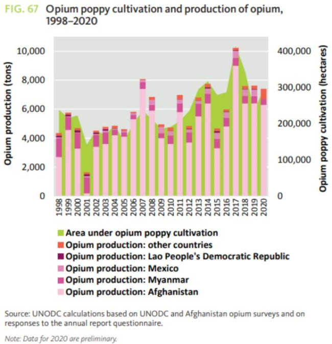 Вердикт о том, что страна является лидером в производстве опия, в докладе 2021 года вынесло Управление ООН по наркотикам и преступности (UNODC). По данным UNODC, на долю ИРА в период 2015-2020 годов приходилось 83 % мирового производства опия. Это при том, что в 2019 году на страну приходилось 69 % мировой площади выращивания опиумного мака.