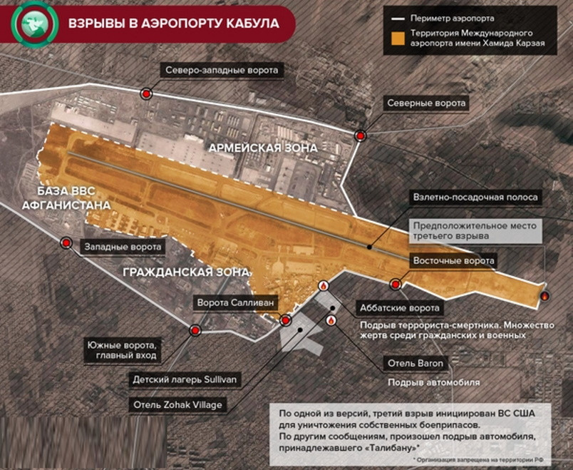 Не менее шести взрывов прогремели на территории Кабула 26 августа, из них три пришлись на территорию, находящуюся в непосредственной близости от международного аэропорта имени Хамида Карзая. Ответственность за атаки взяло на себя среднеазиатское отделение «Исламского государства» (ДАИШ) под названием «Вилаят Хорасан» (обе организации запрещены в РФ).