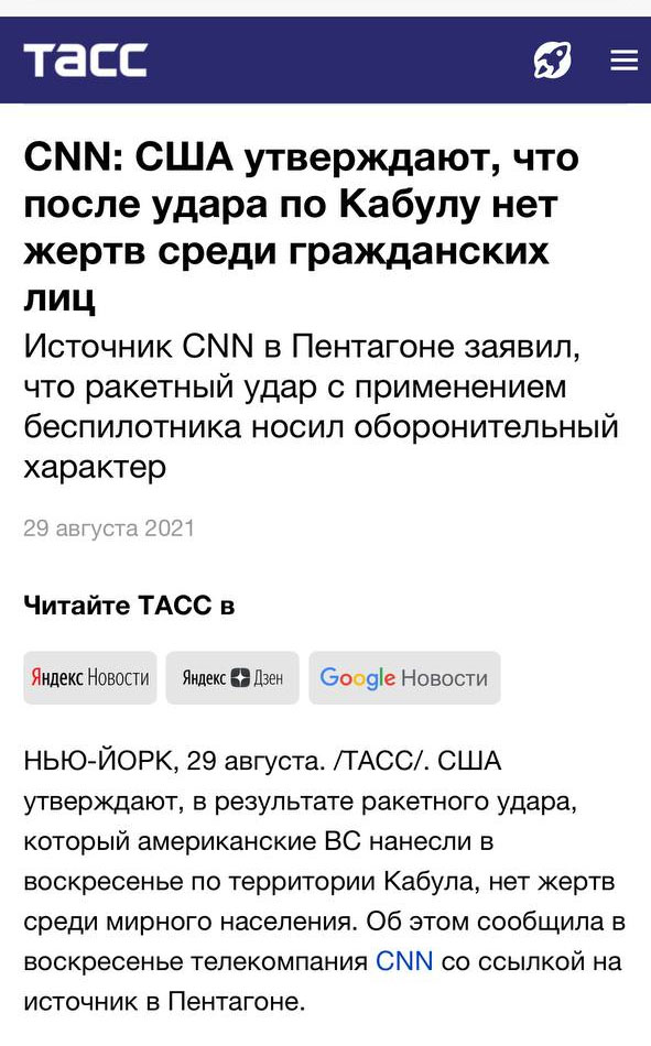 Уже на следующее утро по аэропорту Кабула был нанесён ракетный удар. Ну что, как там с уверенностью, что попали в поставленную цель? Если вы уничтожили террористов и устранили угрозу, то кто же атаковал аэропорт? Или у весьма небольшой ячейки афганского ИГИЛ* были десять запасных планов теракта и двадцать запасных групп на резервных позициях? Угу, конечно.