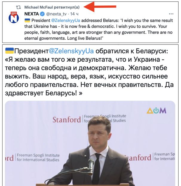 Майкл Макфол ретвитит пост контролируемой спецслужбами США и ЕС Нексты, которая рассказывает о призыве Зеленского к Белоруссии, разумеется с Майданом. Потому что если в вашей стране работают промышленные предприятия, если в ваших госорганах не заседают американские и европейские чиновники, значит у вас нет демократии и свободы.
