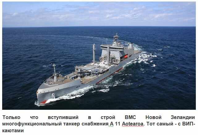 А, тем временем, в Новой Зеландии для её крошечных, в общем-то, военно-морских сил строятся универсальные корабли снабжения ледового класса водоизмещением под тридцать тысяч тонн! На борту которых можно перевозить не только горючее, но и вообще все необходимое контейнерным способом. И вот, что особенно интересно, на этих судах, оказывается, оборудованы даже каюты для «вип-персон»! Вы не скажете – зачем на обычном грузовом судне жилые помещения класса «люкс»?