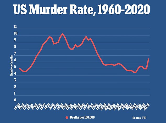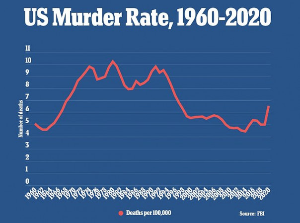 Данные ФБР показывают, что в 2020 году было совершено почти на 5000 убийств больше, чем в 2019 году, в общей сложности около 21 500, хотя это ниже максимумов 1980-х.
