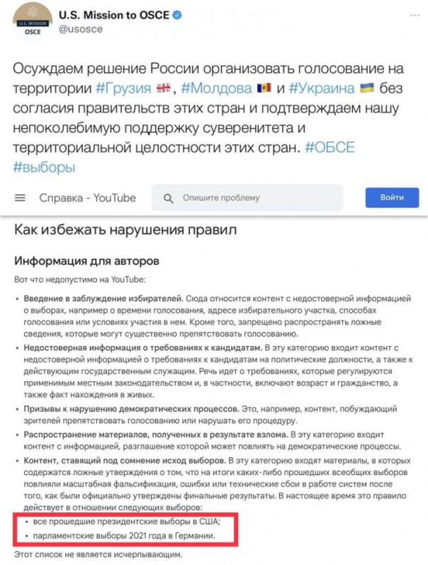 «…недопустимо публиковать контент, ставящий под сомнение исход выборов. В эту категорию входят материалы, в которых содержатся ложные утверждения о том, что на итоги каких-либо прошедших всеобщих выборов повлияли масштабная фальсификация, ошибки и технический сбой в работе систем, после того как были официально утверждены финальные результаты. В настоящее время это правило действует в отношении следующих выборов: