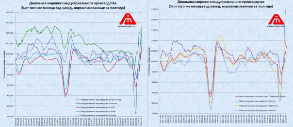 11. Индустриальное производство в процентах от того же месяца предыдущего года с нормализацией за полгода, Россия присутствует на обоих графиках для возможности сравнения, сейчас все портит дикий ковидловый расколбас:
