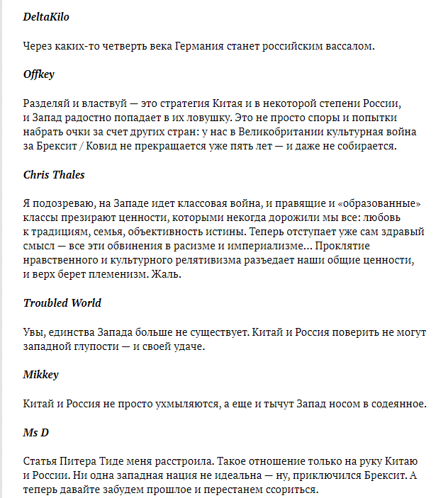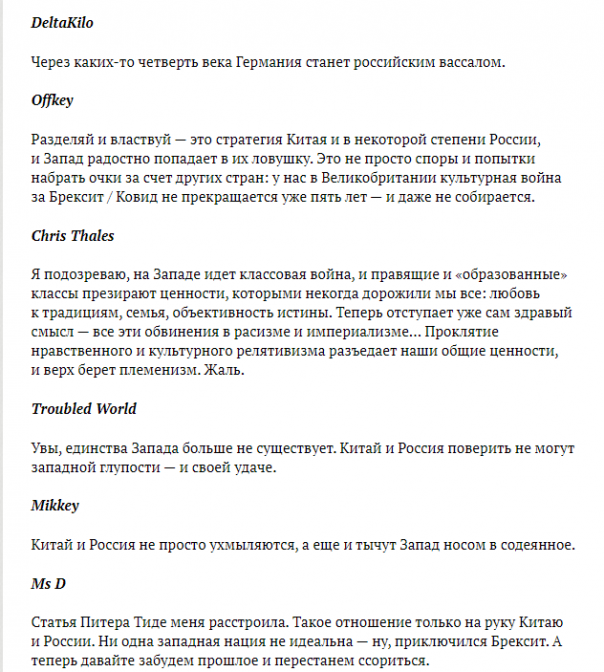 Британские пользователи согласны с мнением журналистов, причем и своего, и немецкого. Они пишут, что лет через 15 Германия станет российским вассалом и вообще пора перестать ссориться, чтобы сохранить единство.