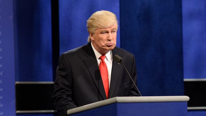 Алек Болдуин пародирует Дональда Трампа, кадр из выпуска шоу "Субботним вечером в прямом эфире" (NBC)