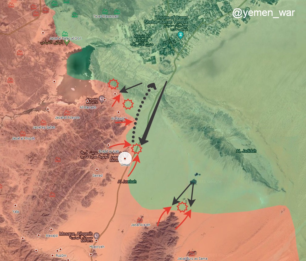 Помимо этого, перешли в наступление силы хуситов севернее Мариба в Джауфе. Сообщается что им удалось взять военный лагерь Ханжар. На данный момент ВВС Саудовской Аравии наносит активные авиаудары по тому участку фронта дабы оборона хадистов от нажима на Мариб с двух сторон не рухнула окончательно.