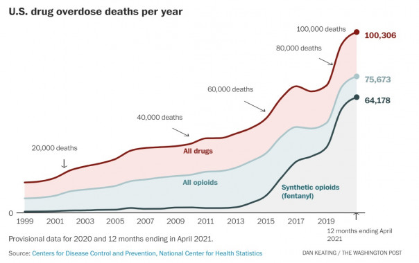 За период с апреля 2020 по апрель 2021 года количество умерших от передозировки наркотиков американцев превысило сто тысяч человек.