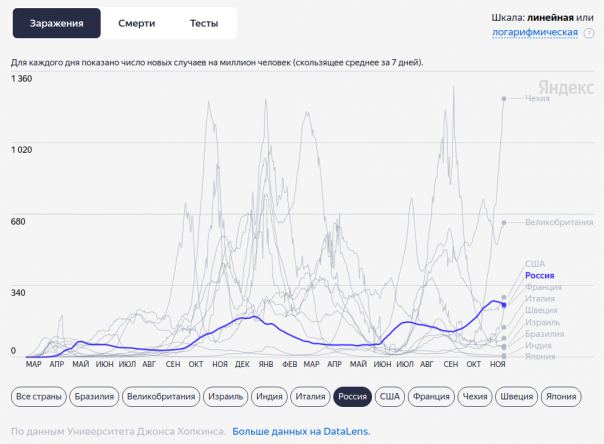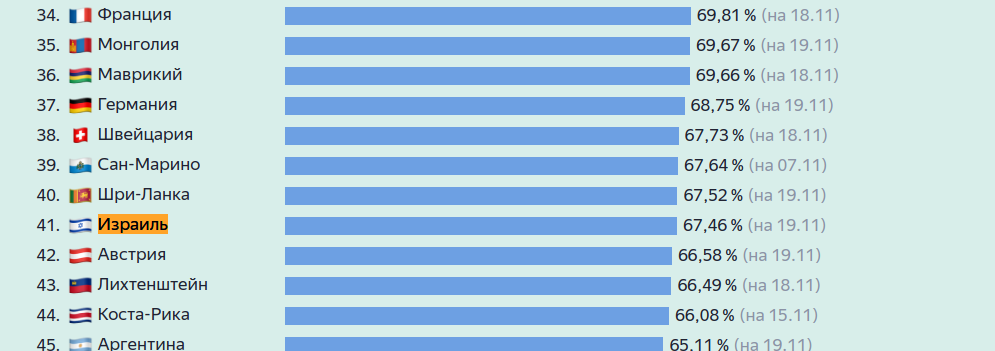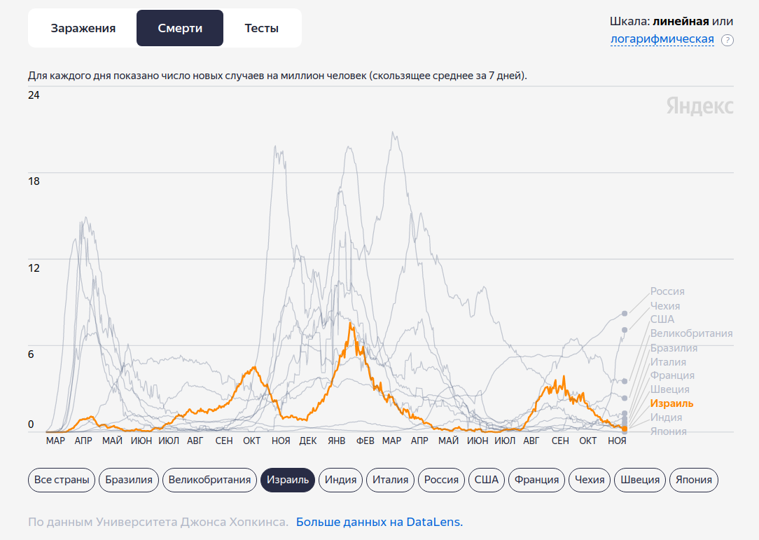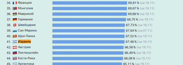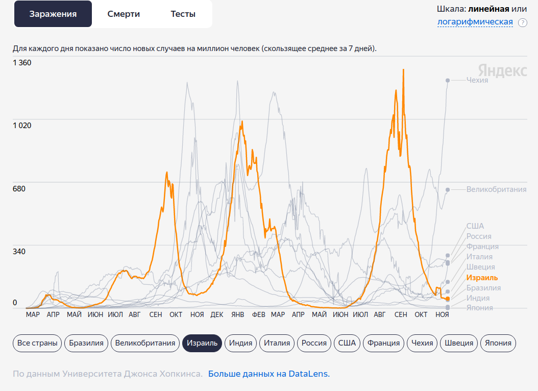Нужны комментарии? Статистика взята отсюда. а там она по данным Университета Джонса Хопкинса. Кстати, вакцинация в Израиле затормозилась. Уперлась в ортодоксов. Но их просто ограничили жестоко - не хочешь не надо. Но сиди дома. Впрочем, взрослое население привито на 90%. И уже почти половина ревакцинирована.