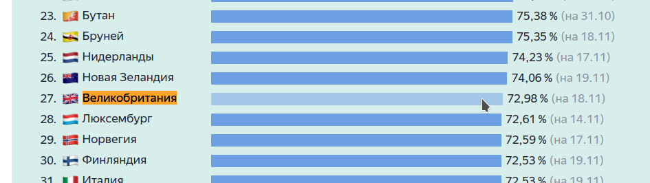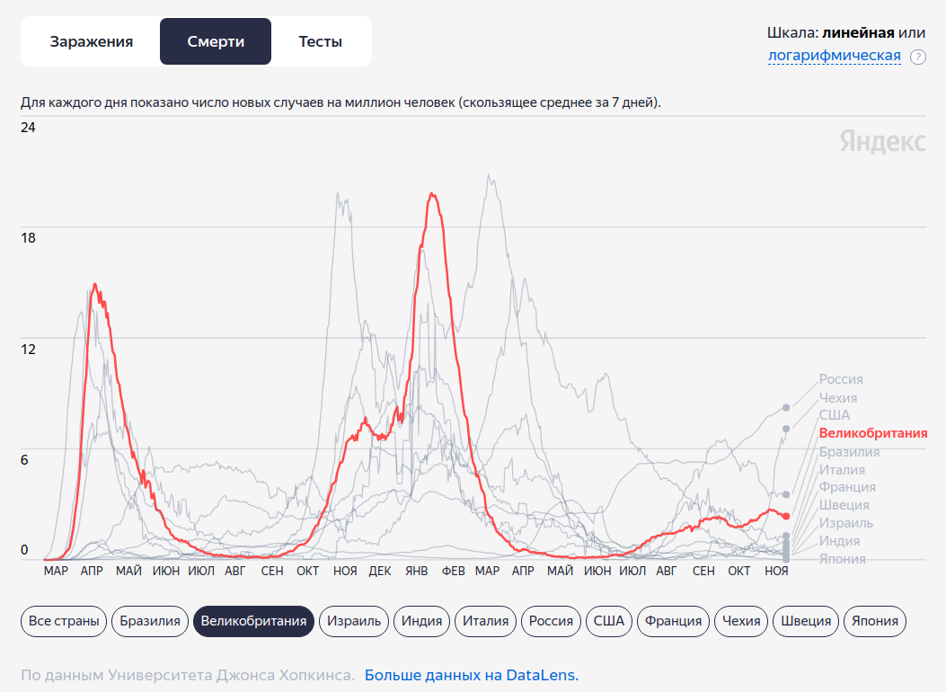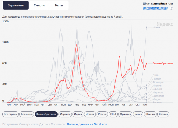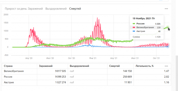 Уровень вакцинации в Великобритании выше уже чем у Израиля. Но смертность тоже выше. Почему? Да потому что ограничений никаких нет. По данным на 20 ноября: