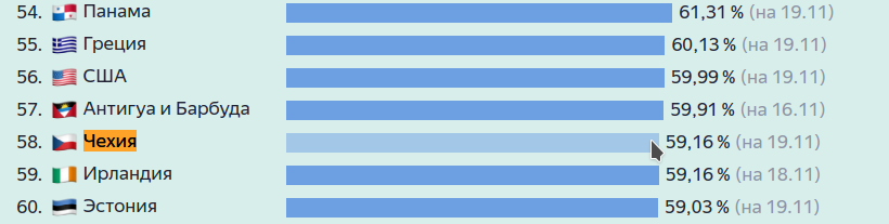 Теперь посмотрим на Чехию. Уровень вакцинации не очень высокий, менее 60%.
