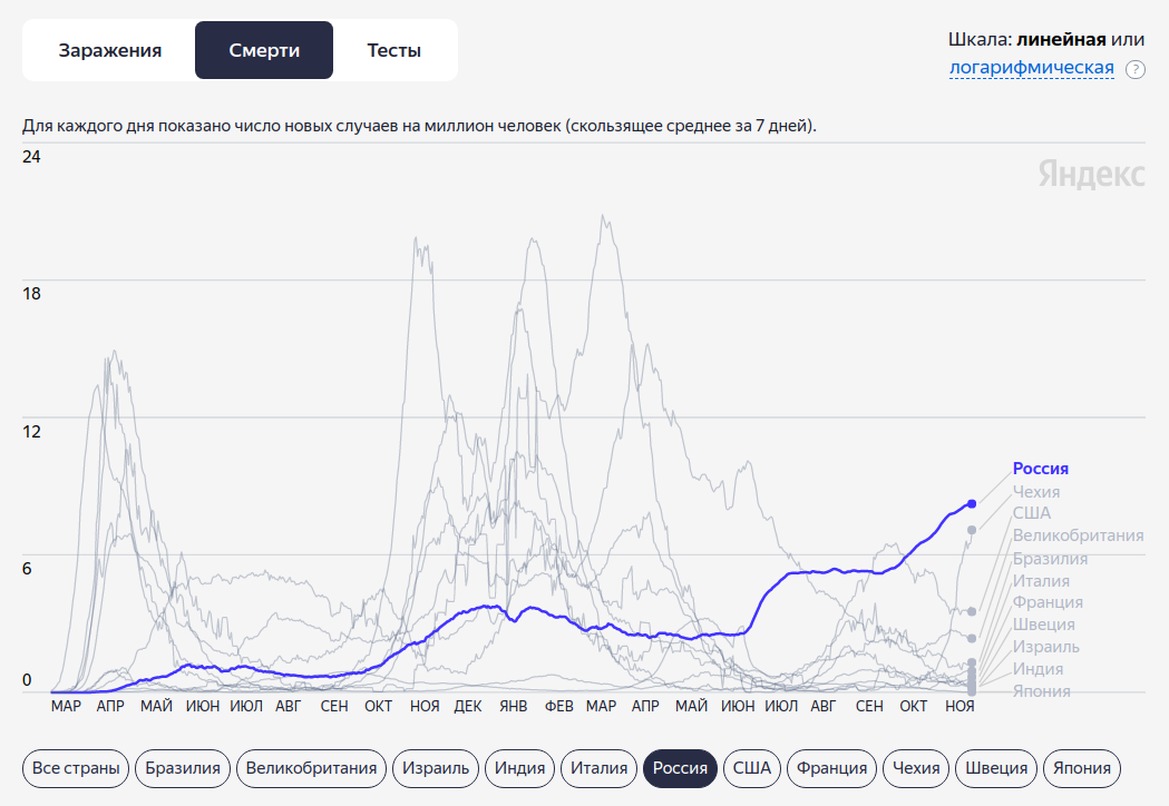 У нас и волна заболеваемости выше чем все предыдущие, чего нет вообще ни у кого. И смертность еще выше чем предыдущие. Потому что низкий уровень вакцинации не способен компенсировать большую опасность Дельта-штамма.