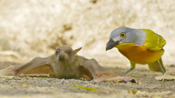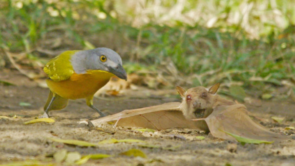 В африканской саване встречаются кустарниковые сорокопуты – небольшие птицы семейства воробьиные. Несмотря на свои скромные размеры, они питаются не только насекомыми, но и грызунами, и змеями, и другими представителями фауны. Заметив крылана, оказавшегося в беспомощном положении, сероголовый кустарниковый сорокопут (Malaconotus blanchoti) попробовал поймать и его.