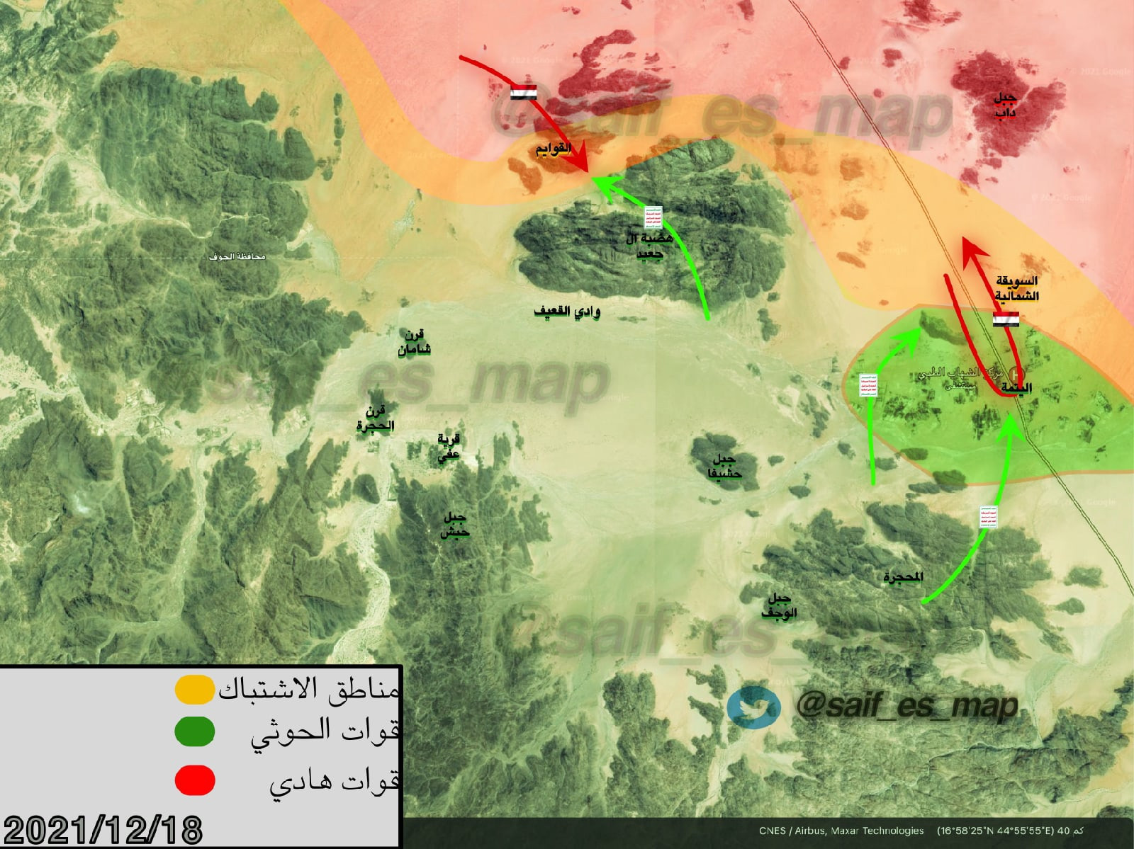 Хуситы смогли захватить ряд горных районов, а также населенный пункт Ятма и перерезать дорогу, соединяющую приграничные районы Йемена с провинцией Мариб. Фактически группировка хадистов оказалась под угрозой окружения. Движение «Ансар-Аллах» сообщает о больших потерях в рядах противника и захвате большого количества пленных и военной техники.