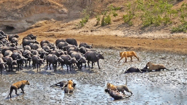 Крупное стадо буйволов пришло на водопой, где их уже поджидал прайд, состоящий из трех десятков львов. Им удалось схватить несколько самых юных особей, но буйволы, заметив потери в своих рядах, вернулись и отогнали врагов.