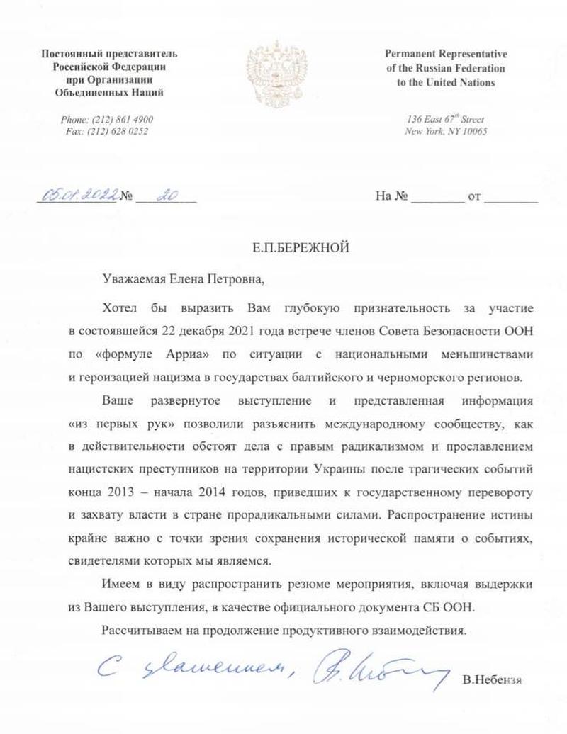 Вчера, 8 января, Елена Бережная получила письмо от постоянного представителя Российской Федерации при ООН Василия Небензи, в котором он поблагодарил её за развёрнутое выступление и представленную информацию «из первых рук». По его словам, доклад Бережной позволил разъяснить мировому сообществу, как действительно обстоят дела с правыми радикализмом и прославлением нацистских преступников на Украине после госпереворота в стране.
