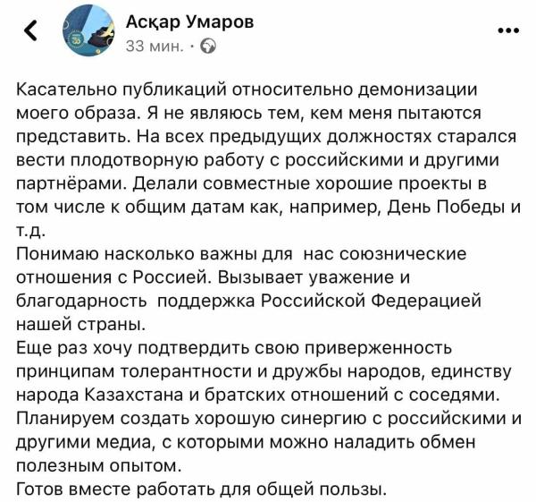 Пост появился в сети совсем недавно, комментарии на странице Аскара Умарова продолжают появляться. Ясно одно – чиновник действительно имеет русофобскую позицию, не намерен от нее отрекаться, и, попав в скандал, решил сгладить его миролюбивыми заверениями. Однако позиции своей не изменил и от русофобии не отрекся – даже публично. Источник