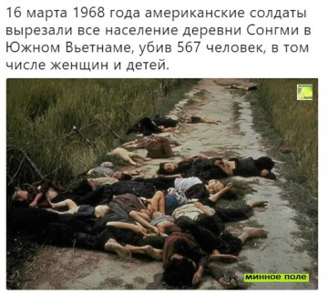 В Сонгми солдаты армии США уничтожили более 500 мирных жителей, в том числе 173 ребенка, 182 женщины, 60 стариков и 89 мужчин в возрасте до 60 лет. Последних хотя бы теоретически можно было принять за комбатантов в горячке боя, если бы тогда, 16 марта 1968 года, имел место бой, а не карательная акция против безоружных крестьян Южного Вьетнама. Тех самых крестьян, которых США на словах «спасали от коммунистической экспансии».