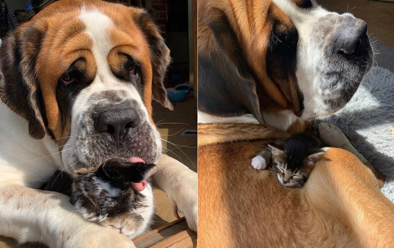 Живущая на ферме в графстве Саффолк (Великобритания) собака по кличке Мейбл стала нянчить котят и защищать новорожденных цыплят. Это выглядит тем более очаровательно, что Мейбл – громадный сенбернар, который со всевозможной аккуратностью опекает своих маленьких друзей.