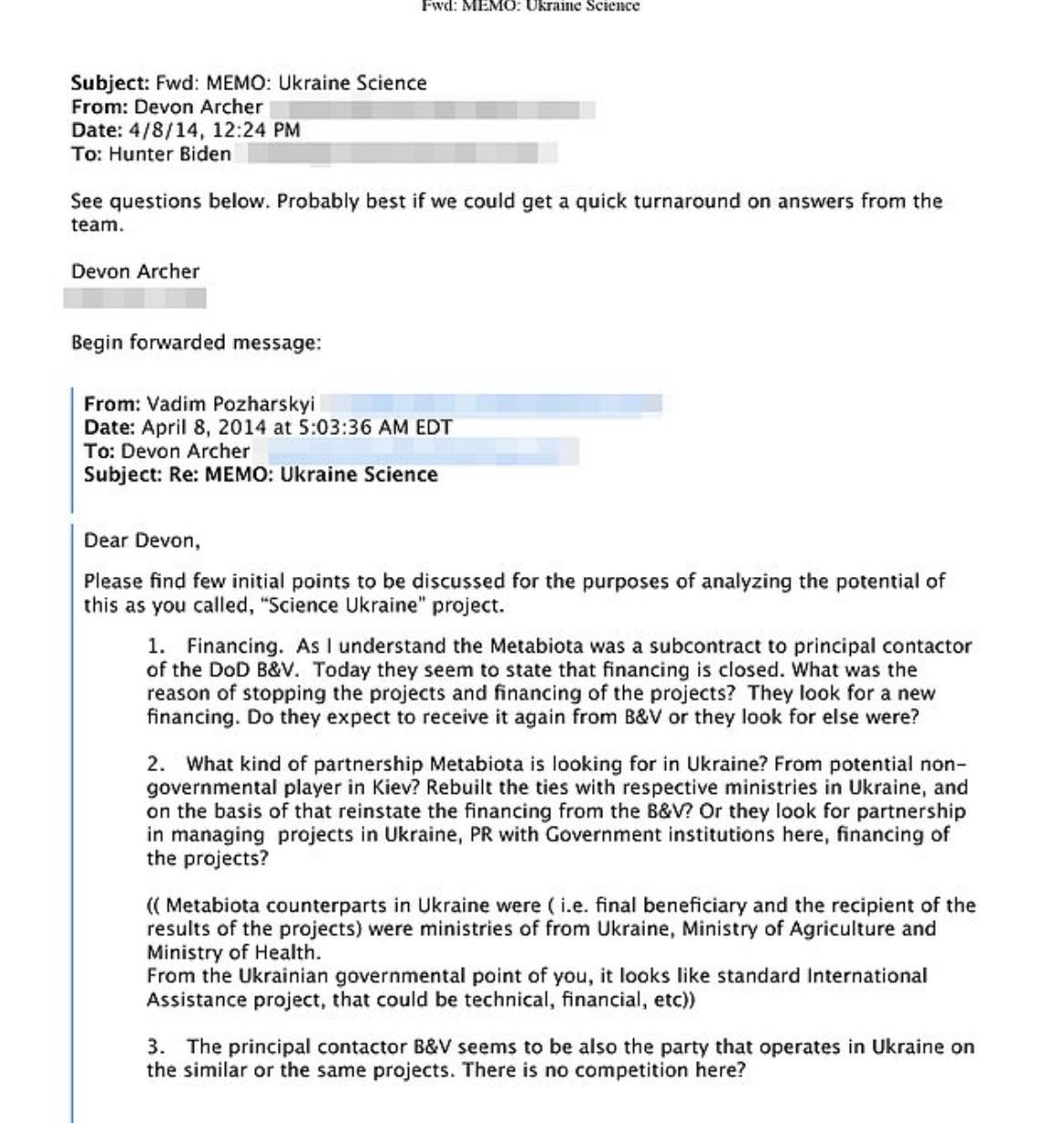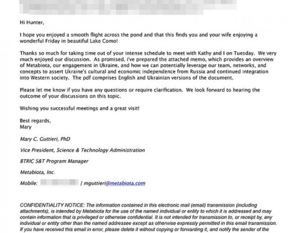 Что до писем, то в одном из них от апреля 2014 года вице-президент Metabiota Мэри Гутьери представляет Хантеру служебную записку, в которой излагает, как они могут «отстоять культурную и экономическую независимость Украины от России».