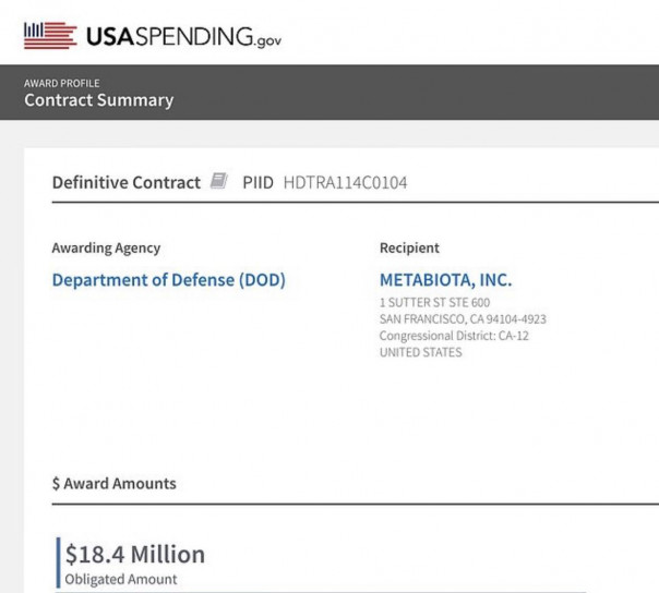 Отчеты показывают, что Министерство обороны США заключило с Metabiota контракт на 18,4 миллиона долларов в период с февраля 2014 года по ноябрь 2016 года, из которых 307 091 доллар был выделен на «исследовательские проекты в Украине». Источник