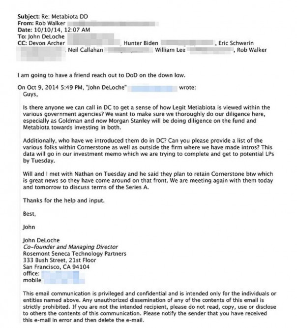А вот еще одно интересное письмо, которое подтверждаем тесные связи между Metabiota с Пентагоном. В нем деловой партнер Хантера по RSTP Роб Уокер пишет, что «попросит друга связаться с Министерством обороны », чтобы доказать добросовестность компании перед потенциальными инвесторами. Goldman Sachs и Morgan Stanley.