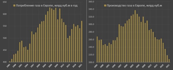 Внутреннее общеевропейское производство газа составляет 208-210 млрд куб.м, причем оно снижается последние 18 лет (с 2004 года). Наиболее обвальный характер снижения добычи газа начался с 2017, с тех пор внутренняя добыча потеряла почти 50 млрд куб.м.