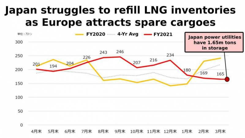 Нужно отметить, что финансовый год в «Стране восходящего солнца» начинается 1 апреля. По состоянию на 31 марта 2022 года наполненность японских газовых хранилищ оказалась близкой к минимумам декабря 2020 года. Тогда в Японии, да и в Южной Корее тоже, возник острый дефицит газа, породивший первые аномальные всплески цен в посткоранавирусной эпохе. Промышленность начала приходить в себя после удара пандемии, но добыча сырья ещё не выросла до нужных пределов.