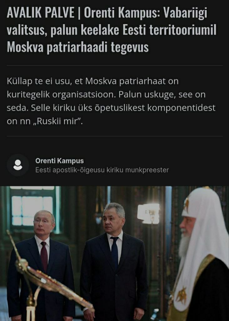 Эстонское Eesti Päevaleht опубликовало мнение Орентия Кампуса, представителя Эстонской Апостольской православной церкви, с призывом к правительству запретить на территории страны деятельность РПЦ Московского патриархата.