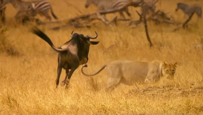 Пока стадо антилоп беззаботно паслось на лугу, львицы приметили детеныша гну, неосмотрительно отдалившегося от стада. Одна из хищниц бросилась в атаку, надеясь на легкую добычу, но наткнулась на массивные рога матери юной антилопы и спешно ретировалась.