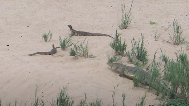 В том же парке Крюгера туристы стали свидетелями необычной сцены: самка крокодила отложила яйца в песок у всех на виду, закопала их, а затем улеглась поблизости и стала греться на солнце. Но вскоре к кладке попытался подобраться нильский варан — самая крупная и распространенная ящерица в ЮАР, которая совсем не прочь полакомиться крокодильими яйцами.