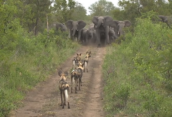 В случае опасности на защиту своего потомства встают все дикие животные — в том числе и африканские слоны. Причем крупнейшие наземные животные порой действуют даже на опережение. Так, в парке Крюшера стадо слонов столкнулось со стаей гиеновидных собак. Слоны сразу же стали встали в боевую позицию и стали издавать устрашающие звуки, обратив противников в бегство.
