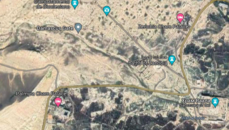 Вот тут видно, где находится отель Пальмира Шам Палас по отношению к храму Баала. Это самый край древней Пальмиры, как раз напротив находятся знаменитые погребальные башни Пальмиры, наиболее хорошо сохранившиеся из которых были взорваны.
