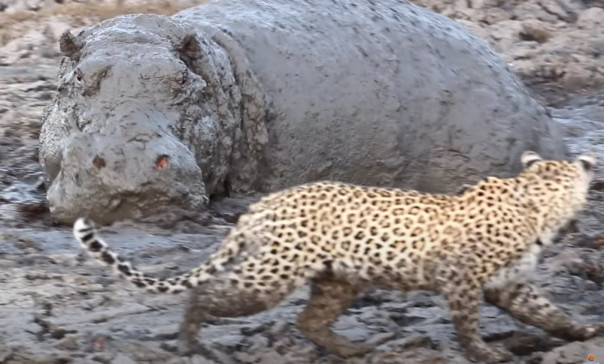 Поскольку в ЮАР наступает сухой сезон, один из водоемов превратился в грязевое месиво, но там все еще обитает рыба. За ней-то и отправилась в самую трясину пятнистая хищница. Леопарды могут похвастаться своим суперкамуфляжем, который помогает им прятаться в засаде, однако на этот раз кошка столкнулась с противником, который замаскировался получше – отдыхающим в грязи бегемотом.