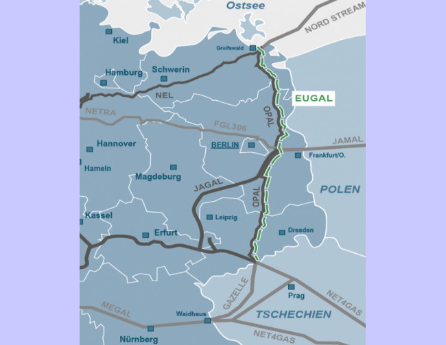 Магистраль идет с севере страны на юг — до границы с Чехией. До последнего времени по нему подавали газ из «Северного потока» и таким образом обходили ограничения к сухопутному продолжению первого балтийского газопровода — Opal. По EUGAL топливо подается в южную часть страны. Мощность магистрали составляет 55 млрд кубометров, а протяженность — 480 километров.