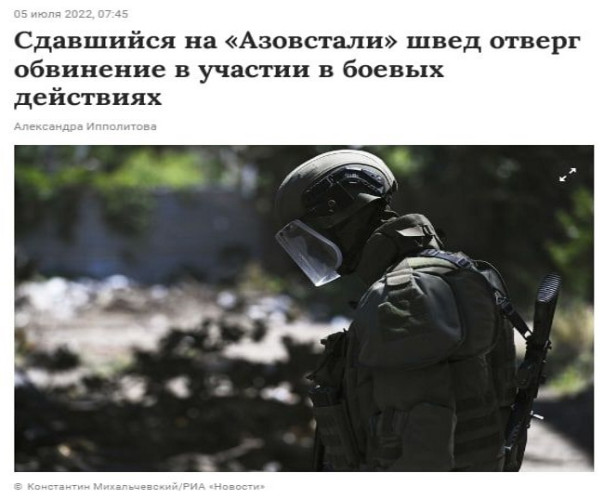 Затем стало известно, что следователи ДНР предъявили обвинение в участии в боевых действиях в составе украинских вооружённых формирований в качестве наемников некоему подданному Швеции, который сдался в плен на металлургическом заводе "Азовсталь" в Мариуполе: «В отношении гражданина Швеции возбуждено уголовное дело, предъявлено обвинение по ст. 430 УК ДНР («Наемничество»). С обвиняемым ведутся следственные действия». Имя иностранного наёмника не разглашается в интересах следствия.
