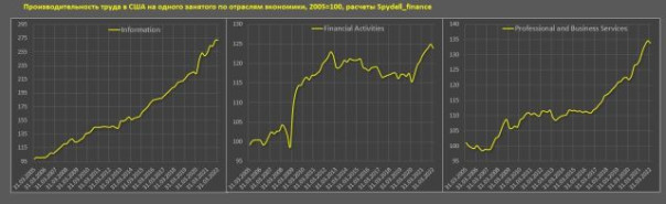 Производительности труда в информационном секторе выросла на 172% с 2005, в финсекторе на 24%, а в бизнес-услугах на 34%. Растет то, что легко масштабируется и то, что имеет возможность экспорта.