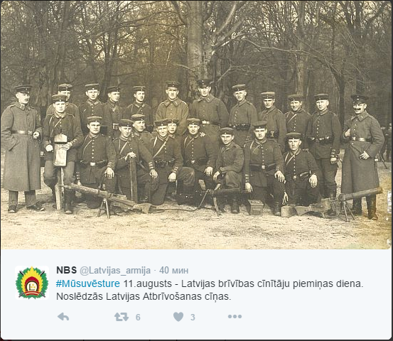Утренний твиттер принёс первое же сообщение, гласившее о том, что 11 августа - памятный день во всей Латвии - день памяти о воинах, сражавшихся за свободную, и, заметьте, независимую Латвию в начале прошлого века. Ну и для украшения этого сообщения приобщена фотография той эпохи: