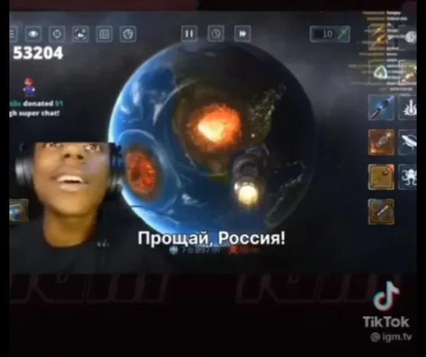 Семнадцатилетний американский блогер и стример Даррен IShowSpeed Уоткинс во время онлайн-трансляции решил сыграть в видеоигру, смысл которой заключался в ядерной бомбардировке континентов и стран. После того как он сбросил первую бомбу на Тихий океан, молодой человек спросил у аудитории, какую страну ему уничтожить, и зрители сразу же потребовали уничтожить Россию.