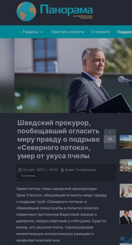 Диверсия на газопроводах «Северный поток-1» и «Северный поток-2» продолжает обрастать трагическими инцидентами. После гибели директора фирмы, обслуживающей российские газопроводы, Питера Гриземана найден мертвым заместитель главы шведской прокуратуры Эрик Ульссон. Он обещал огласить миру правду о подрыве труб «Северного потока» и обвинял спецслужбы в попытке изъятия первичных протоколов Береговой охраны о диверсии.