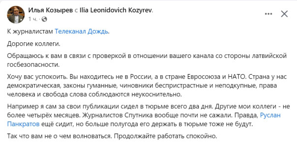 Латвийский активист Илья Козырев очень тонко "поддержал" "Дождь". Я даже представляю, как он ржал, когда писал этот текст. Источник
