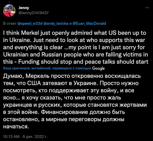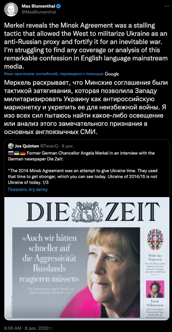 Зарубежный Twitter переваривает недавнее интервью экс-канцлера ФРГ газете Zeit. Там Ангела Меркель заявила, что Минские соглашения были просто попыткой "дать Украине время". Ещё раньше эту мысль озвучил бывший президент Украины Пётр Порошенко.