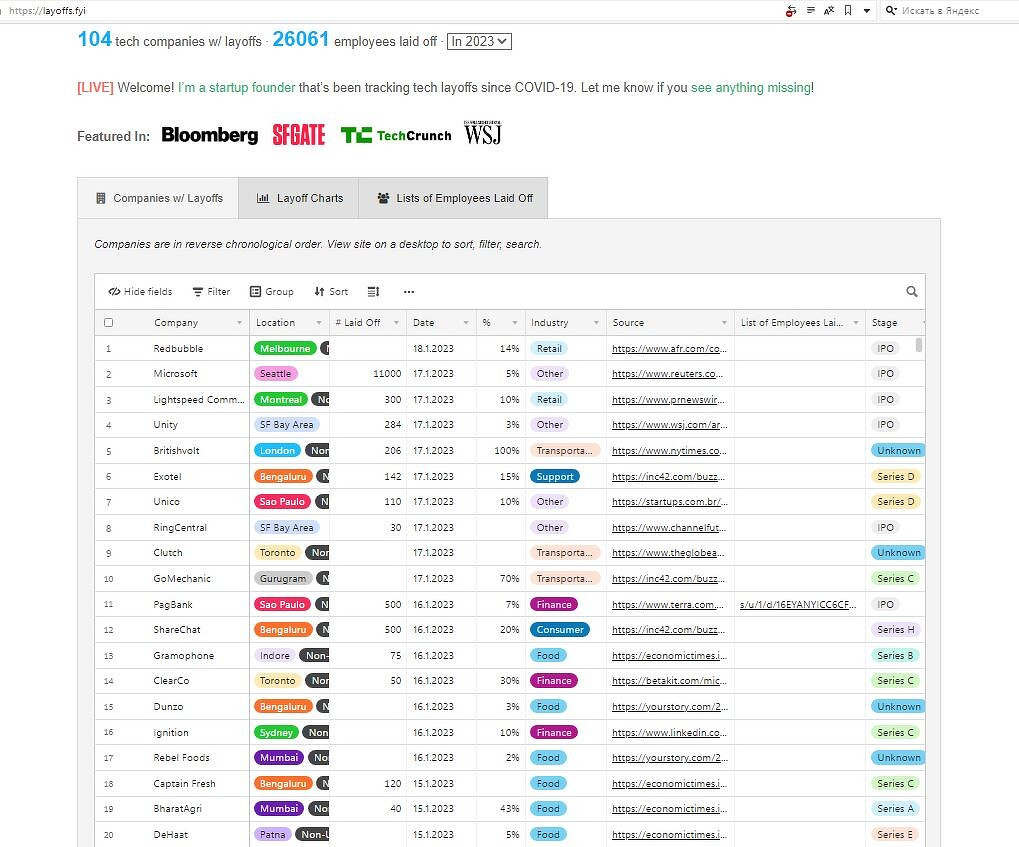 Проект Layoffs.fyi был создан в 2019 г. для отслеживания увольнений во время пандемии коронавируса COVID-19.