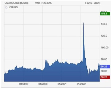 А теперь рассмотрим экономическую войну. Оставим в стороне её камуфляж в виде карательных санкций. Я уже занимался этим вопросом и обращал внимание на то, что они не являются судебными решениями и незаконны с точки зрения международного права. Давайте лучше рассмотрим валюты. Доллар давил рубль на протяжении двух месяцев, а затем снова упал до значения, которое он имел в период с 2015 по 2020 год, при этом Россия не влезла в долги. Другими словами, так называемые санкции оказали незначительное влияние на Россию. Они сильно нарушили её торговлю в течение первых двух месяцев, но сегодня они ей никак не мешают. Впрочем, они ничего не стоили для США и тоже никак на них не повлияли.