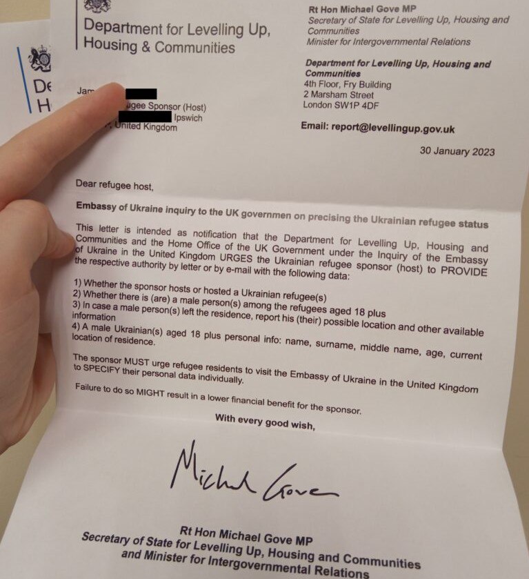 30 января он получил официальное письмо от Департамента по вопросам равноправия, жилья и общин Правительства Великобритании (фото письма публикуется), которое было инициировано посольством Украины в Лондоне и в котором от него потребовали следующую информацию: